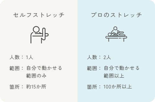 プロのストレッチはトレーナーが身体の状態を見極めながら、自分で動かす以上の範囲までしっかり伸ばし、柔軟性を向上。